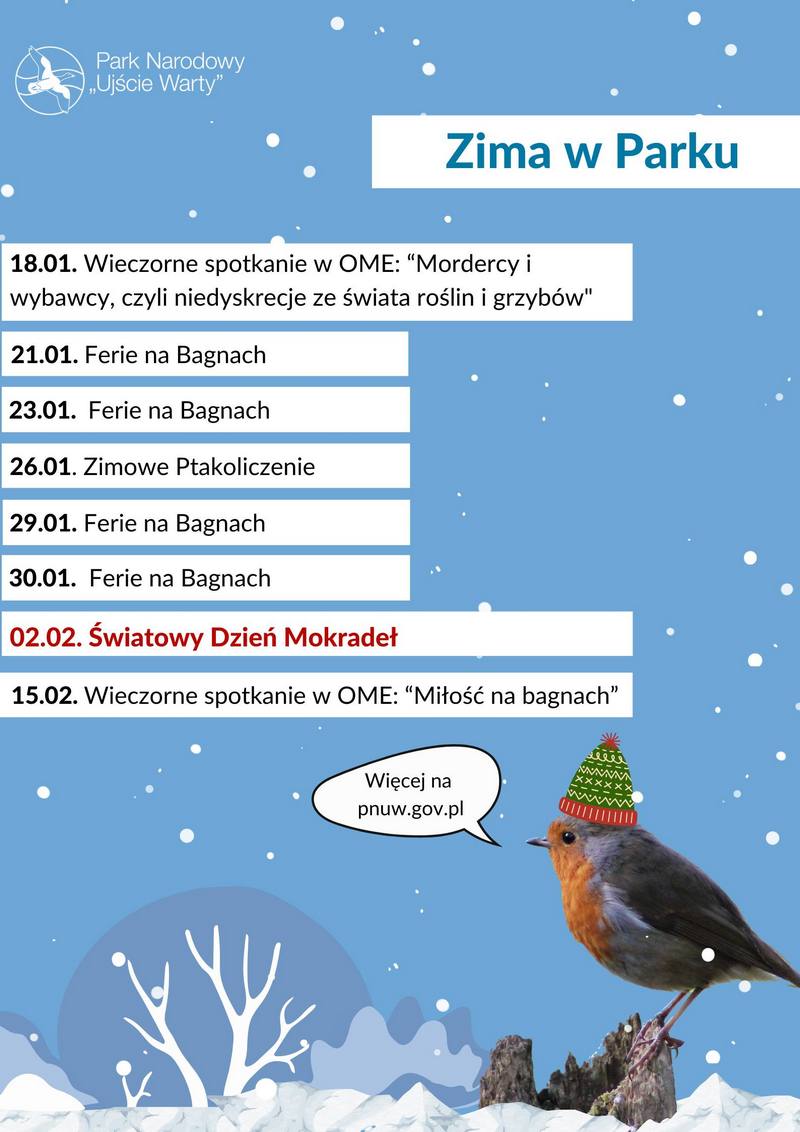 Jak co roku nie mogło też w naszych planach zabraknąć wycieczki w ramach Zimowego Ptakoliczenia. 26 stycznia 2025 r. będziemy wspólnie liczyć ptaki, które zostały z nami na zimę. Wyruszamy o godzinie 9.00. spod pałacu w Dąbroszynie. Przejdziemy wspólnie ok. 3 km a wycieczkę zakończymy ogniskiem. Do aut trzeba będzie wrócić tą samą trasą (3 km). Zapraszamy dorosłych i rodziny z dziećmi. Na wycieczkę można się zapisać od 13.01.2025 r. mailowo na adres edukacja@pnujsciewarty.gov.pl lub telefonicznie 95 752 40 26.