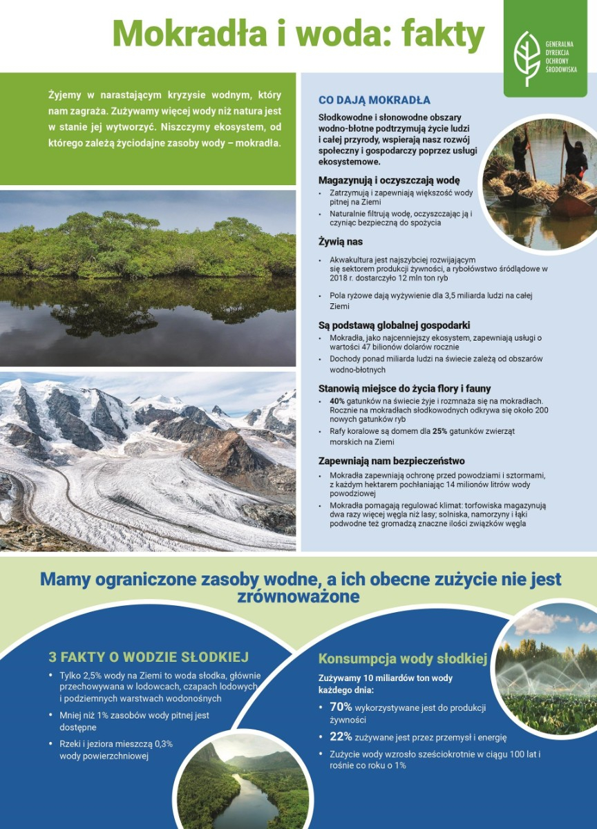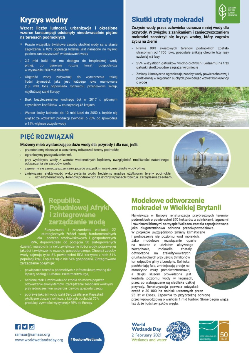 Narastający kryzys wodny, spowodowany działalnością człowieka i zmianami klimatu, zagraża ludziom i przyrodzie. Osuszając mokradła, niszczymy nieodwracalnie zasoby wody, bogaty świat roślin i zwierząt oraz usługi ekosystemowe, które świadczą ekosystemy podmokłe. Mokradła magazynują i oczyszczają wodę, są podstawą globalnej gospodarki, zapewniają nam bezpieczeństwo i dają wyżywienie, a roślinom i zwierzętom oferują miejsce do życia.