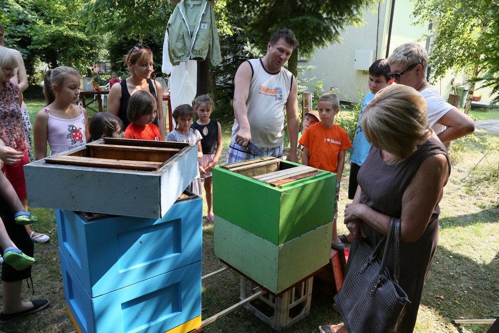 Pokaz ula od jego wnętrza fot. K. GajdaJednakże nigdy jedna z tych przyczyn nie jest warunkiem wystąpienia tego zjawiska. Dopiero ich kumulacja wywołuje masowe wymieranie pszczół. W Polsce występuje 450 gatunków pszczół. Jednym z nich jest pszczoła miodna. Pozostałe dzikie gatunki pszczół zamieszkujące np. dziuple drzew, czy szczeliny skalne występują pod dosyć trudnymi nazwami: koczownice, zadrzechonie, murarki, obrostki, makatki, pszczolinki i wiele, wiele innych. Tak jak różne są nazwy tak i różny jest ich wygląd. Najmniejszymi pszczołami występującymi w Polsce są smukliki osiągające 4-5mm a największymi samice trzmiela 25mm.
