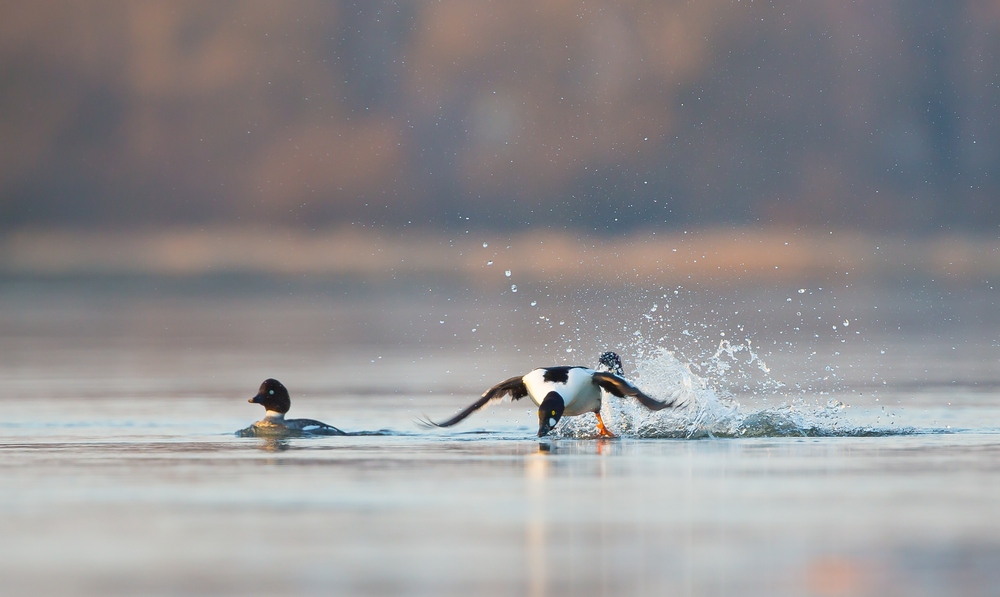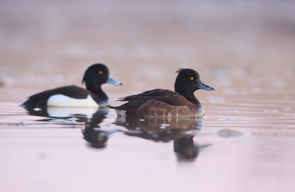 Gągoły fot. Krzysztof GajdaJednak karmnik to nie jedyne miejsce na tego typu spotkania i szanse na fotograficzne łowy. Generalnie zimową porą w większości przypadków zamarzają zbiorniki wodne, ale nie rzeki (chyba że ich brzeg). To jest kolejne potencjalne miejsce uwiecznienia ptasiej chwili na klatce aparatu. Najlepiej jest położyć się nad jej brzegiem w miejscu gdzie wiemy, że koncentrują się ptaki. Nie zawsze jest to łatwe, bo musimy położyć się w takim momencie kiedy jest ciemno, albo gdy ptaków nie ma. Co ważne: podstawą jest tutaj dobry, nieprzemakalny, ciepły ubiór i ponownie kwestia kamuflażu. Na jakie ptaki możemy tutaj liczyć? Głównie kaczki, takie jak: gągoły, nurogęsi, krzyżówki, czernice, ale i kormorany, łabędzie nieme i krzykliwe.