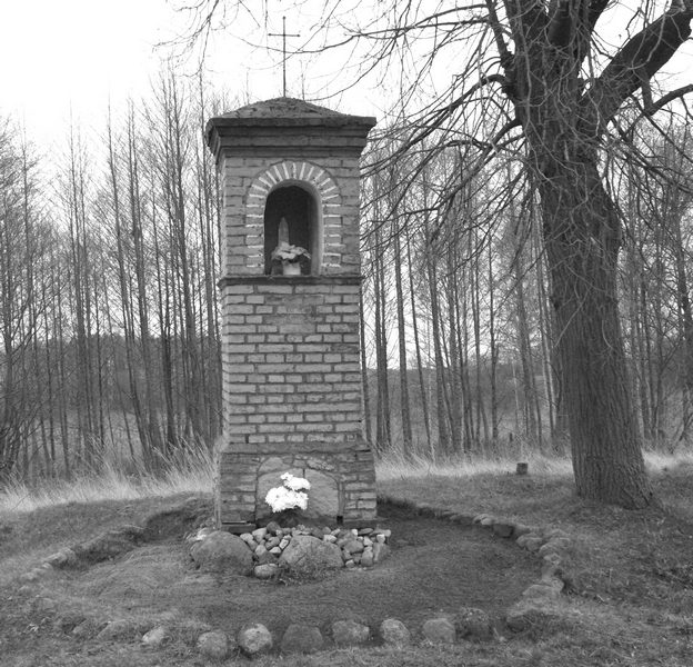Pisałem już o dwóch kapliczkach w miejscowości Stołuń przy wyjeździe do Kuligowa, jednej z św. Wojciechem, a drugiej z Najświętszą Marią Panną. Kolejna znajduje się po drugiej stronie wsi, przy drodze do Szarcza, naprzeciw ceglanego budynku byłej szkoły. Wyznacza ona granice zabudowań Stołunia. We wnęce ustawiono niewielką figurę Najświętszej Maryi Panny w białej szacie ze złotymi zdobieniami i w koronie. Kapliczka jest murowana, ceglana, stylem przypomina architekturę budynku byłej szkoły. Fundamenty posadowiono z kamienia.