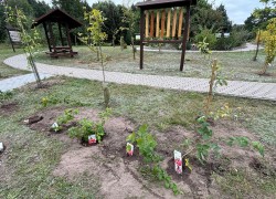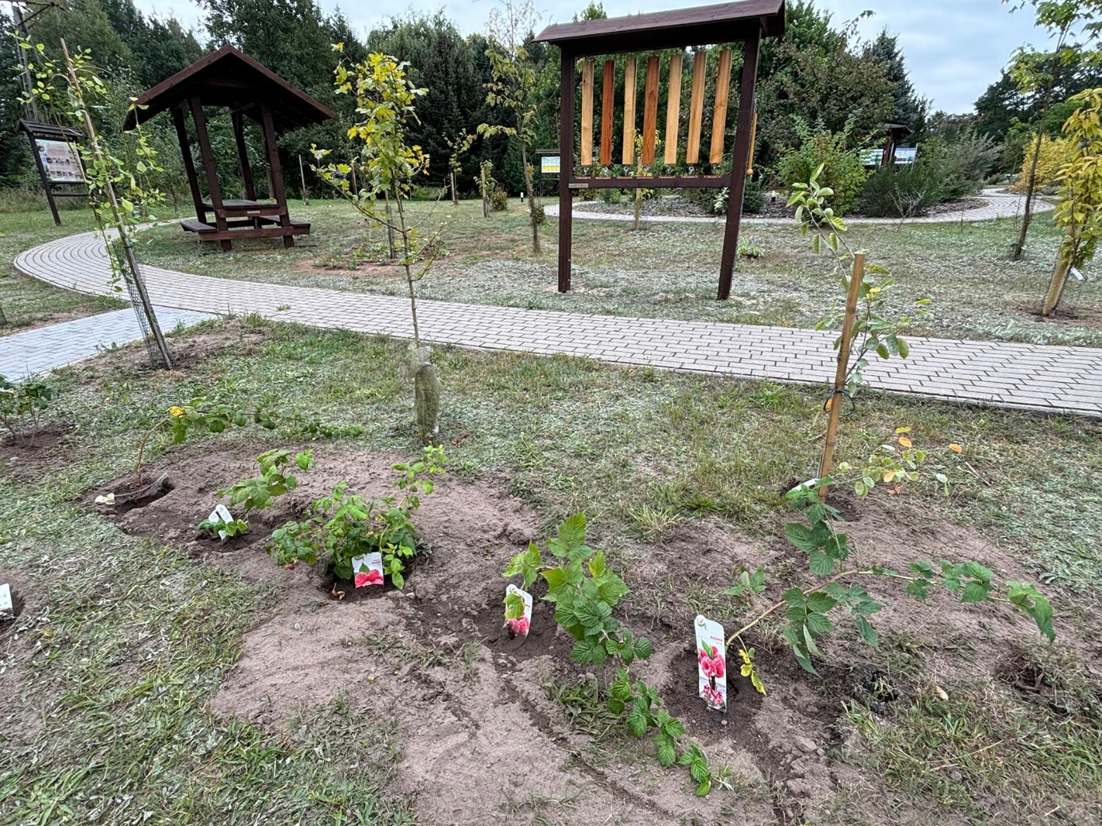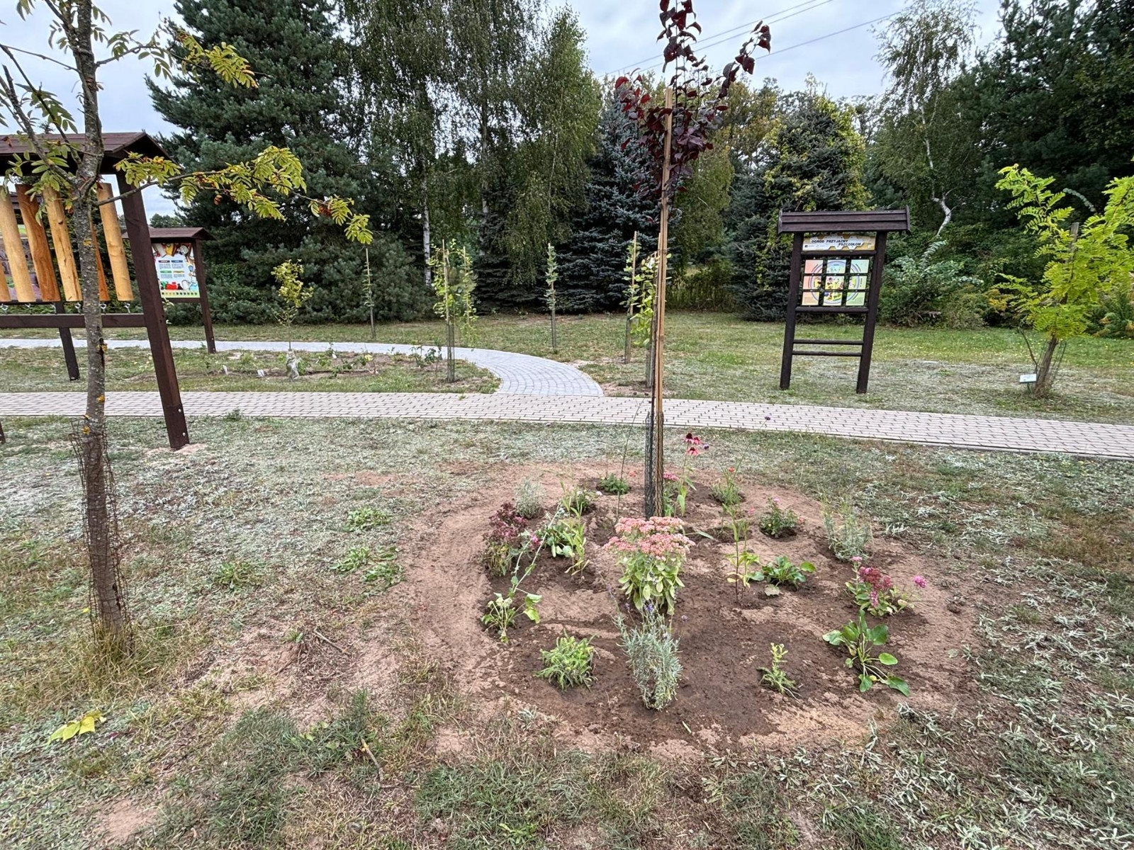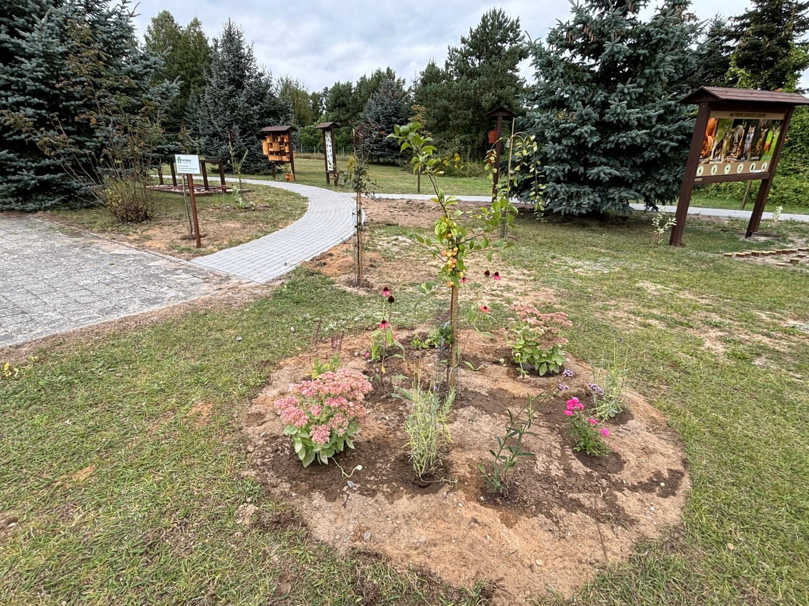 W ramach ostatniego etapu prac, w ogrodzie pojawiły się drzewa, krzewy i byliny, w ilości łącznie ok. 140 szt. Rośliny zostały posadzone wraz z wymianą gleby oraz opalikowaniem drzew. Działanie jest kontynuacją i poszerzeniem istniejącego na terenie OEP ogrodu dydaktycznego i pozwoli na uatrakcyjnienie prowadzonych zajęć przyrodniczych. Nasadzenia umożliwią zapoznanie uczestników zajęć z rodzimymi gatunkami różnymi zmysłami tj. wzroku, dotyku, węchu i smaku.