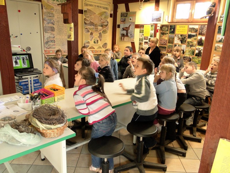 POMOCE DYDAKTYCZNE: eksponaty, m.in. czaszki, poroża, kły, gniazda, odchody itp., gry i zadania tematyczne, oraz dofinansowane przez WFOSiGW – lupy, tropy zwierząt (odlewy)
